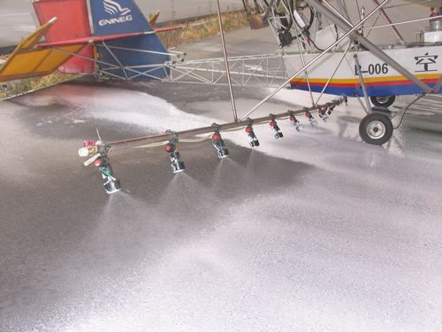 2.性能特點:整個系統(tǒng)設備工作時,高壓電源可同時輸出足夠強的正、負直流高壓供給左、右機翼下掛載的靜電噴頭的金屬管形電極(20~100個)工作。這時每個管形電極圓周空間范圍形成一個高壓靜電場,其空間內的空氣是電離狀態(tài)的,產(chǎn)生大量的自由電子,噴嘴高速噴出的細小而均勻的霧粒經(jīng)過這個電離空間時就被動地攜帶上了電荷(正電荷或負電荷,這個過程叫霧滴充電或荷電)。帶電的霧滴具有向地表植物作定向運動和受靶標植物表面主動親和吸附的特點。因此,航空靜電噴霧時在靶標植物表面的沉積密度遠遠高于非靜電噴霧,為非靜電噴霧的1~2倍,尤其是葉片的背面更為明顯;航空靜電噴霧過程中,由于帶電霧滴作明顯的定向沉積運動,就大大減少了霧滴的漂移損失。大約可減少30~50%的漂移損失。正由于此,航空靜電噴霧設備的噴灑施藥效率比非靜電噴霧或常規(guī)航空噴霧大大提高,可提高有效用藥量45~50%,可節(jié)省用藥量45%,單架次噴灑面積可擴大近一倍,節(jié)省近42~50%的作業(yè)架次和作業(yè)費用,這對基層防治部門和執(zhí)行航空噴灑作業(yè)的通航部門都是雙贏的。